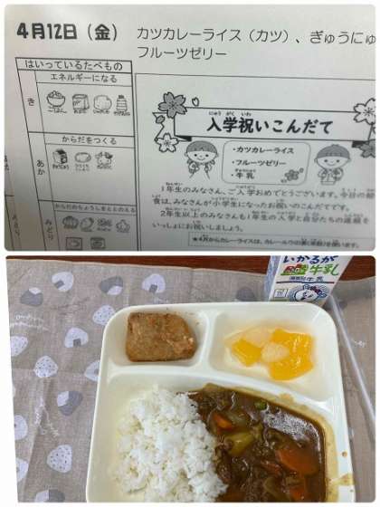 今日の給食は「カツカレーライス・牛乳・フルーツゼリー」です。