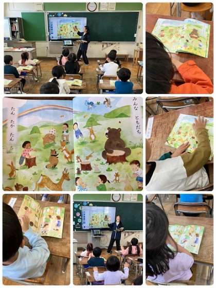 1年生の国語の学習です。みんなで元気よく、音読をしていました。