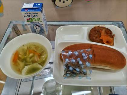 今日の献立は、「黒糖パン」「牛乳」「煮込みハンバーグ」「野菜スープ」「ミニフィッシュ」です。