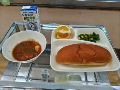今日の献立は、「黒糖パン」「牛乳」「ビーフシチュー」「さんど豆とコーンのサラダ」「甘夏柑」です。