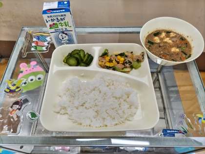 今日の献立は、「ご飯」「牛乳」「麻婆豆腐」「きゅうりの中華和え」「ツナとチンゲン菜の炒め物」です。