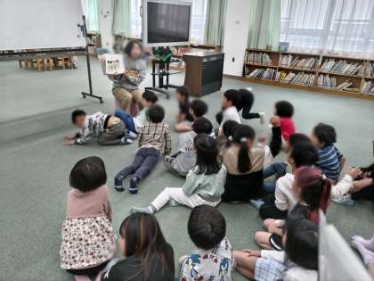図書ボランティアの方による「読み聞かせ会」がありました。今日のお話は、「ともだち」「こんとあき」です。子どもたちは、「そうだ!そうだ!」「いやだ!いやだ!」とボランティアの方と受け答えしながら、とても楽しんでいました。今日も素敵な本の世界に入ることができました。