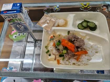 今日の献立は、「豚丼」「牛乳」「きゅうりの梅風味」「白玉だんご(きな粉)」です。