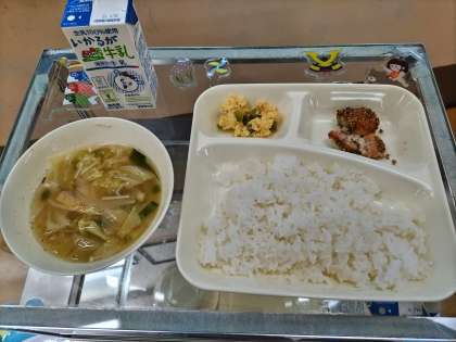 今日の献立は、「ご飯」「牛乳」「鮭のごまみそ焼き」「五目汁」「えんどうの卵とじ」です。