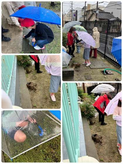 大阪市立環境科学研究センター、大阪市環境局の方が来られ、校庭の「生き物さがし」を行いました。あいにくの雨でしたが、短時間でもたくさんの生き物(植物。動物)を見つけることができました。