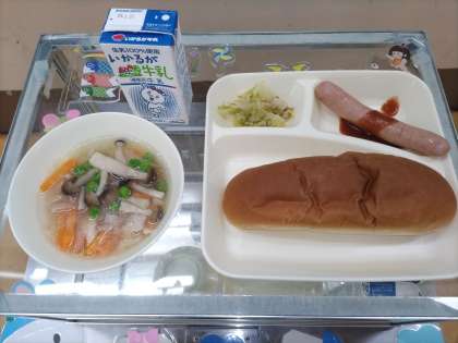 今日の献立は、「黒糖パン」「牛乳」「ウインナーのケチャップソース」「スープ」「焼きツナキャベツ」です。