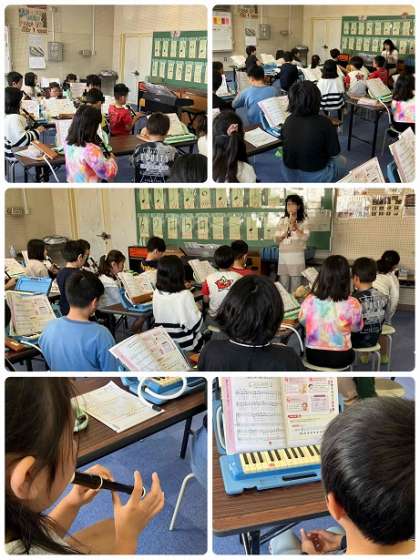 4年生の音楽です。「音の高さに気をつけながら、明るい声で歌いましょう」のめあてで「いいことありそう」という曲を歌っています。その後、リコーダーに挑戦しました。
