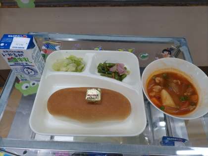 今日の献立は、「コッペパン」「バター」「牛乳」「ケチャップ煮」「ベーコンとさんど豆のソテー」「キャベツのバジル風味サラダ」です。