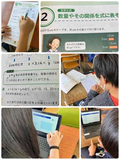 6年生の算数です。「文字と式(数量やその関係を式に表そう)」の学習です。xやyの文字を使い、数量の関係を式に表していました。その後、スタディアプリを活用し、復習を進めていました。