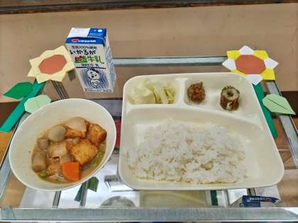 今日の献立は、「ご飯」「牛乳」「ちくわの磯辺揚げ」「厚揚げと里芋の味噌煮」「あっさりキャベツ」です。