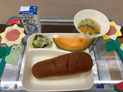 今日の献立は、「黒糖パン」「牛乳」「鶏肉とかぼちゃのシチュー」「ミックス海藻のサラダ」「クインシーメロン」です。