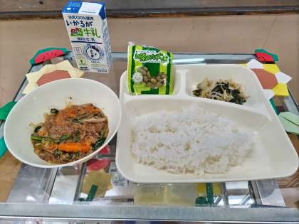 今日の献立は、「ご飯」「牛乳」「マーボー春雨」「チンゲン菜ともやしの甘酢和え」「抹茶大豆」です。