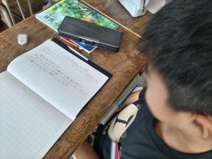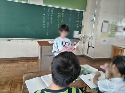 「〇〇が出てきて、△△なことがあって、さいごは□□になる話」に入る言葉や文を一人ひとりが考え、ノートに一生懸命に書き、発表していました!