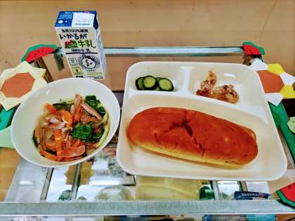 今日の献立は、「おさつパン」「牛乳」「鶏肉のから揚げ」「ハムと春雨のスープ」「きゅうりの中華和え」です。