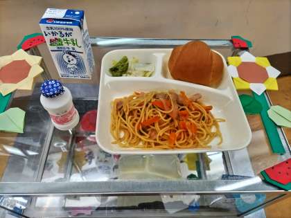 今日の献立は、「ミニコッペパン」「牛乳」「チキントマトスパゲッティ」「グリーンアスパラガスとキャベツのサラダ」「発酵乳」です。