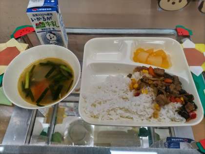 今日の献立は、「夏野菜飯」「牛乳」「パワースープ」「トロピカルゼリー」です。