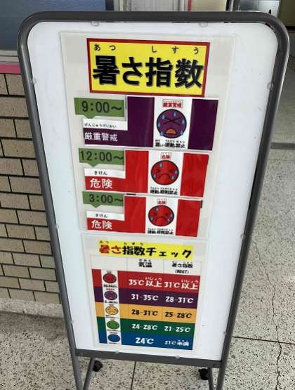 暑い日が続きます。玄関に「暑さ指数」の掲示板が設置されています。