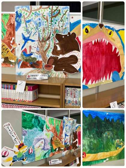 図書委員が作成したペープサートを図書室に掲示しています。迫力満点です!!