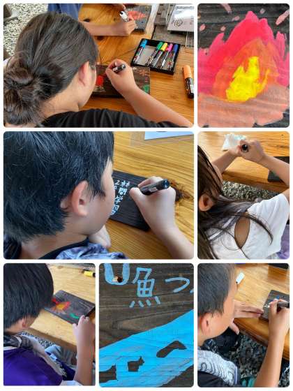 焼き板のペン入れをしました。2日間の思い出を描いています。素敵な作品がたくさん完成しました。