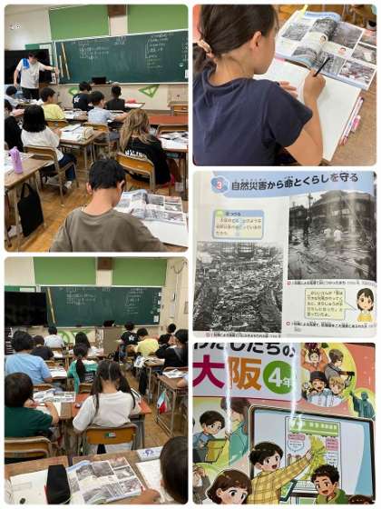 4年生の社会科です。「自然災害から命とくらしを守る」の学習です。地震や台風など、自然災害からどのように助け合っていくか、役所の仕事も学びながら、みんなで考えました。