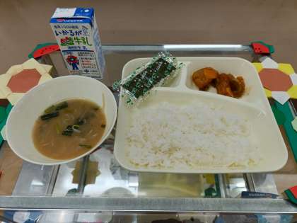 今日の献立は、「ご飯」「牛乳」「酢豚」「中華みそスープ」「焼き海苔」です。