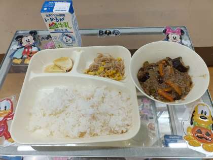 今日の献立は、「ご飯」「牛乳」「麻婆なす」「ツナと野菜の炒め物」「焼きサツマイモのの甘みつかけ」です。