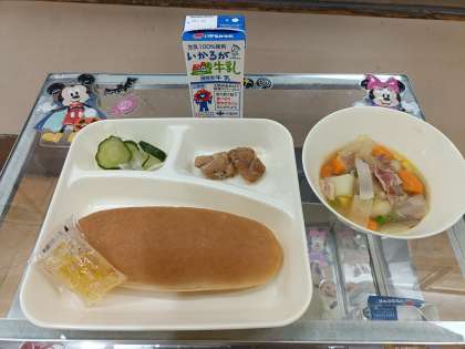 今日の献立は、「コッペパン」「マーマレード」「牛乳」「鶏肉のバジル焼き」「ベーコンと野菜のスープ煮」「キャベツときゅうりのサラダ」です。