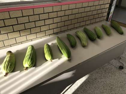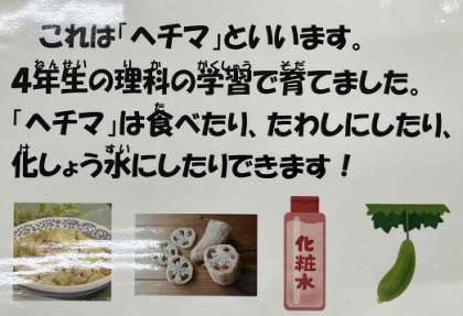4年生の理科の学習で育てているヘチマを収穫しました!ヘチマは食用やたわし、スポンジ、化粧水にも活用できます。