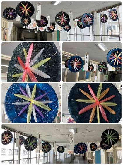 3年生の教室前の廊下に「花火」が打ちあがっています。夜空に舞い上がった「花火」を表現しています。きれいですね。
