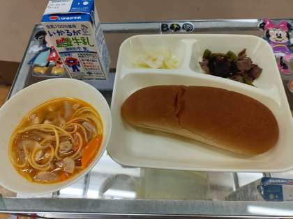 今日の献立は、「黒糖パン」「牛乳」「牛肉の香味焼き」「トマトのスープスパゲッティ」「キャベツのサワーソテー」です。