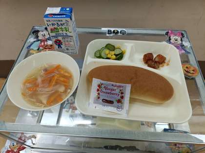 今日の献立は、「コッペパン」「いちごジャム」「牛乳」「まぐろのオーロラ煮」「スープ」「きゅうりとコーンのサラダ」です。