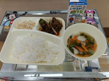 今日の献立は、「ご飯」「牛乳」「プルコギ」「トック」「もやしのナムル」です。