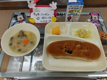今日の献立は、「レーズンパン」「牛乳」「鶏肉とさつまいものシチュー」「白菜のピクルス」「柿(平種無し柿)」です。