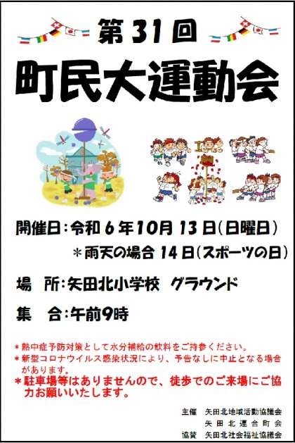 第31回 町民大運動会が矢田北小学校グラウンドで行われます。是非、参加してください!!