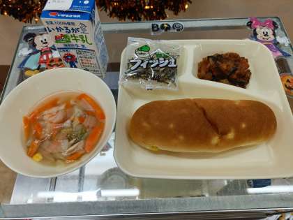 今日の献立は、「おさつパン」「牛乳」「なすのミートグラタン」「鶏肉とキャベツのスープ」「ミニフィッシュ」です。