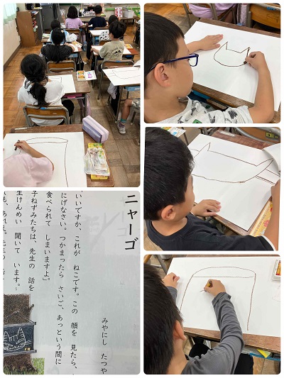 国語科で学習している「ニャーゴ」を描きました。かわいい猫がたくさん描かれました。