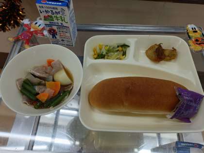 今日の献立は、「コッペパン」「ブルーベリージャム」「牛乳」「鶏肉のカレー風味焼き」「スープ煮」「野菜のソテー」です。