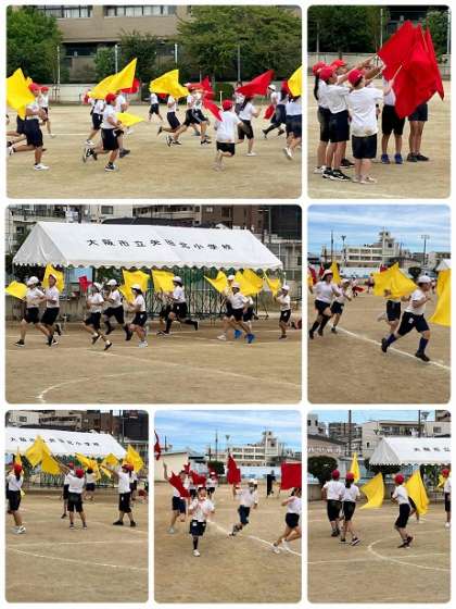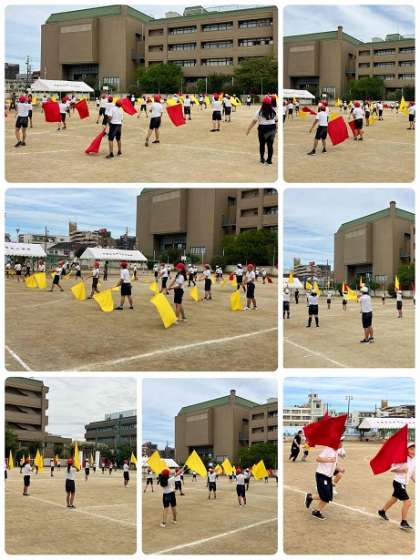 5・6年の練習の様子です。フラッグを持って、音楽に合わせての練習です。自分の立つ位置の確認も行いました。当日の演技を楽しみにしていてください。