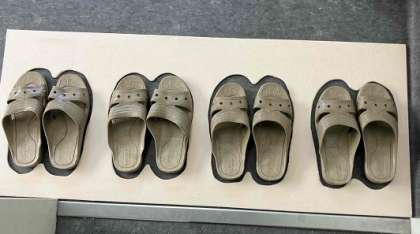 簡単に「はきもの」をそろえることができるように、本校の管理作業員がスリッパの型わくを製作しました。1年生、2年生の学級近くのトイレに設置しています。パズル感覚でそろえてくださいね。