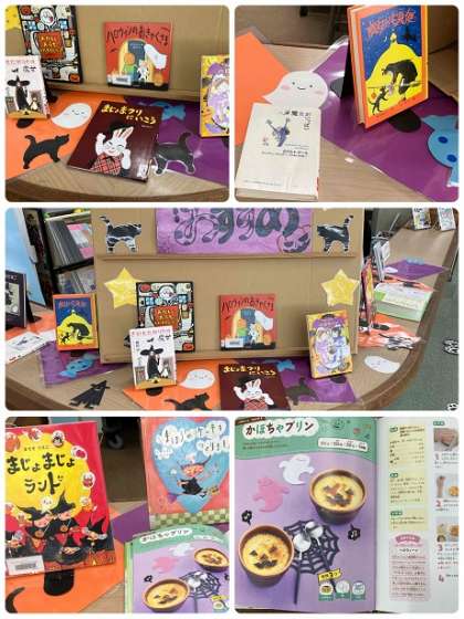 10月の図書室です。「ハロウィーンのおすすめ」をテーマに本を選び、展示しています。「魔女の宅急便」「まじょまじょランド」「まじょまつりにいこう」などがあります。・・・