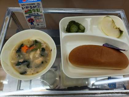 今日の献立は、「コッペパン」「ブルーベリージャム」「牛乳」「鶏肉ときのこのシチュー」「きゅうりのピクルス」「りんご」です。