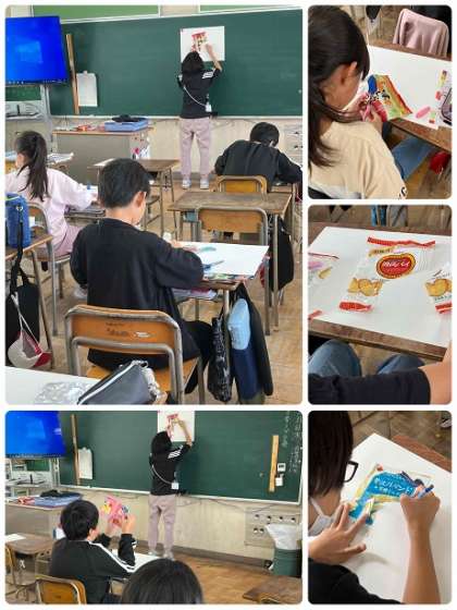 5年生の図画工作です。お菓子のパッケージを切り抜いて画用紙に張り、切り抜いたところを絵で描きます。みんなどの部分を切り取るのか考えながら、真剣に取り組んでいます。