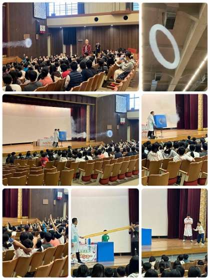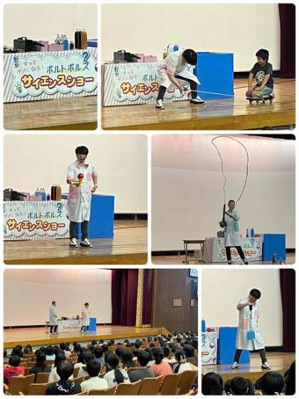 日本教育弘済会のご協力により「サイエンスショー」を全校児童で鑑賞しました。ボルトボルズが、笑ってためになる科学実験を披露してくれました。