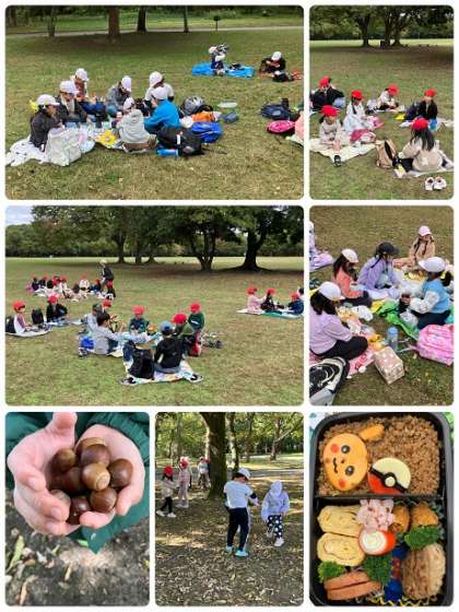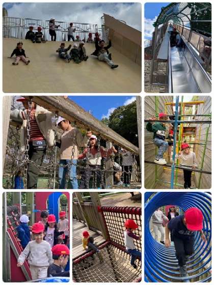 公園には、大きなすべり台や遊具があり、楽しく遊びました。何度も何度もすべり台に挑戦する子、おにごっごをする子、アスレチックに挑戦する子と時間を忘れて、体を動かしました。公園には、たくさんどんぐりの木があったので、どんぐり拾いもしました。