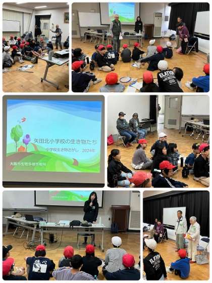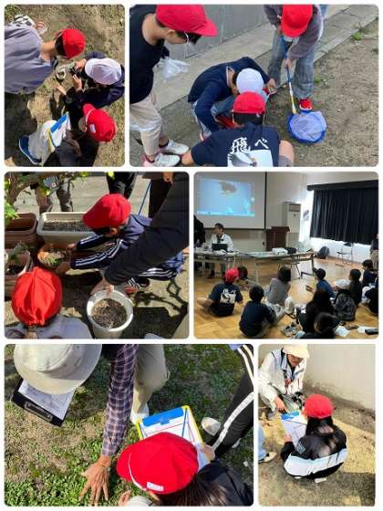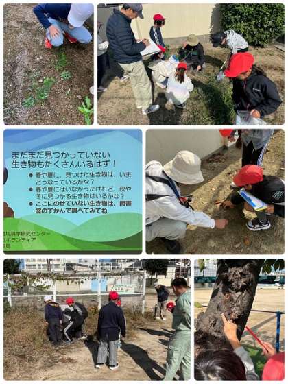 大阪市立環境科学研究センター、大阪市環境局の方が来られ、校庭の「生き物さがし」の2回目を行いました。5月には、96種類の生き物(植物・動物)を見つけることができましたが、今回は5月とは違う生き物が〇〇種類見つけることができました。