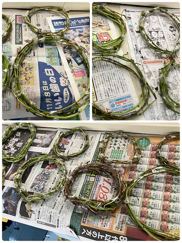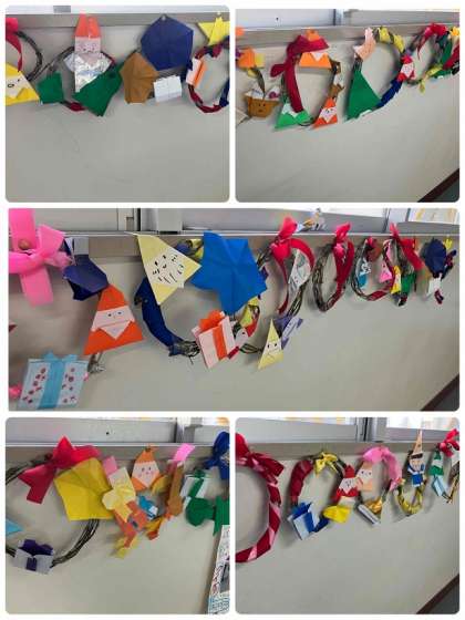 2年生の教室の前に「さつまいものつる」で作成したリースがあります。飾りつけをして素敵な作品ができました。(12月15日 記事)