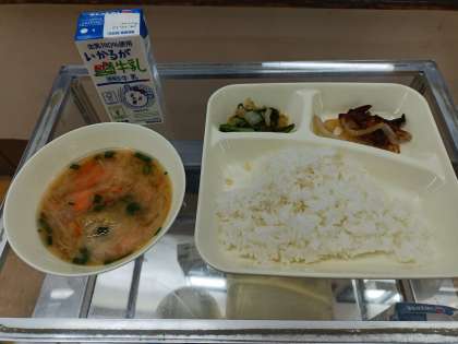 今日の献立は、「ご飯」「牛乳」「豚肉の生姜焼き」「さつまいものみそ汁」「菊菜と白菜の胡麻和え」です。