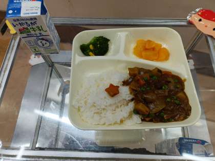 今日の献立は、「冬野菜のカレーライス」「牛乳」「ブロッコリーとコーンのサラダ」「黄桃(缶)」です。