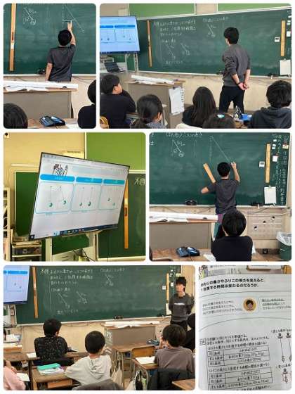 5年生の理科の授業です。「ふりこのはたらき」について学んでいます。「おもりの重さやふりこの長さを変えると、1往復する時間は変わるのか」について予想を立てています。次回、実験で確認します。