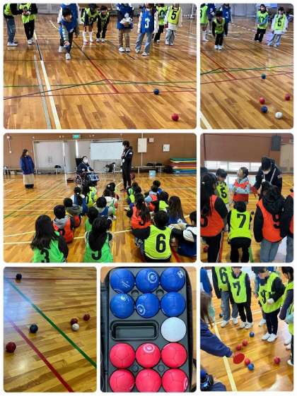東住吉区社会福祉協議会の方に来ていただき、ボッチャ体験をしました!!ルール説明の後、練習をしていよいよ試合です。時間がたつにつれ、子どもたちのアプローチも上達してきました。白熱の試合が続きました!!
